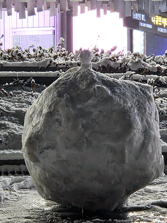 누군가 만든 대형 눈 공 위에