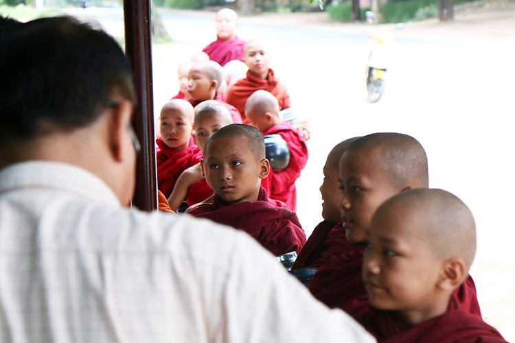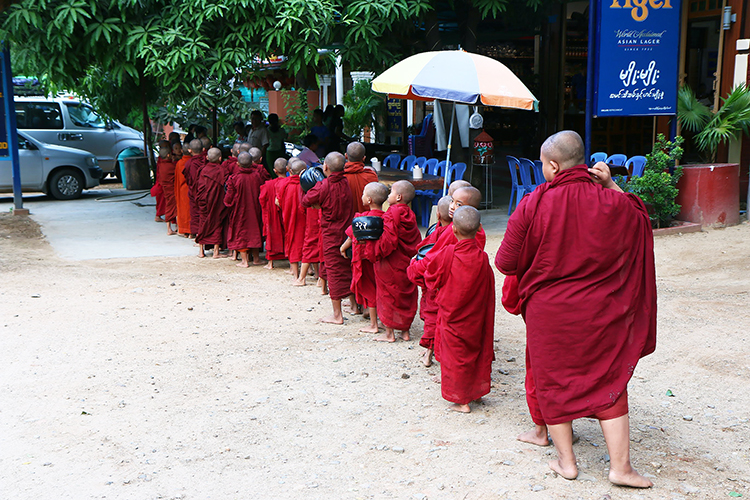 다음 음식점에 줄지어서 탁발을 기다리는 아이들